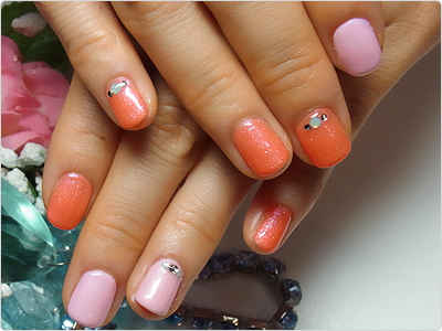 パステルのピンクとオレンジのMIXネイル。小さく光るストーンがさりげなくて上品ですね。