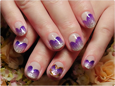 2月のお得なジェルデザインのアレンジ。ハートに見立てたモコモコをパープルにしただけでグっと大人の女性に。