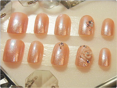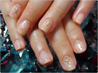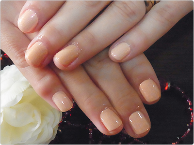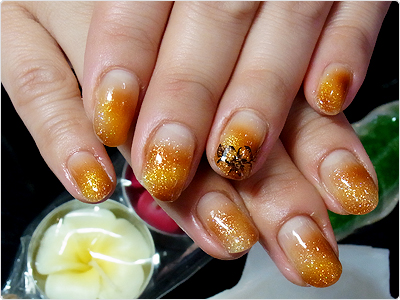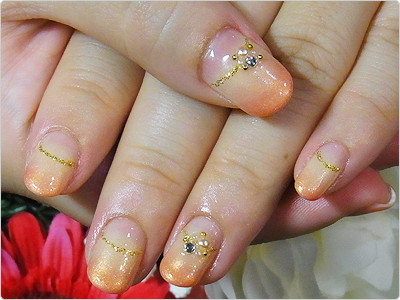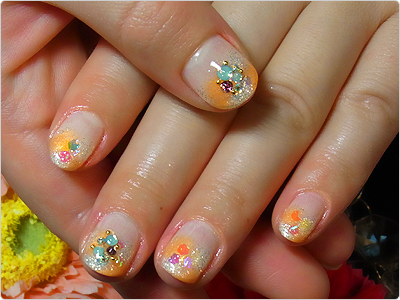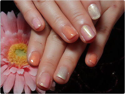 7月のGN色違い。オレンジのラメ・ホログラムとベージュのシェルを使って、よりナチュラルにっ。