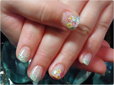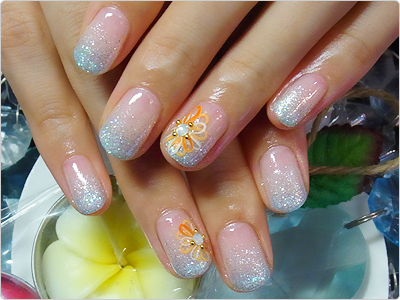 優しいホワイトシルバーと水色のラメをダブルグラデーション。ビタミンカラーで描いたお花がとっても可愛らしいですね。