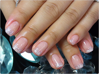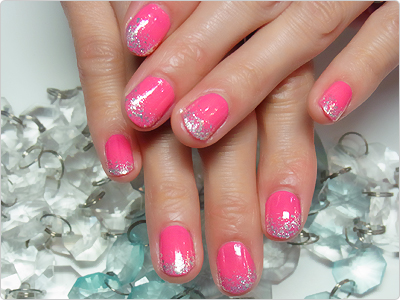 お急ぎの方にはマニキュアのカラーリングのみもできます。華やかなピンクにプラチナの様なラメをかけて、キラキラ&先端強化!