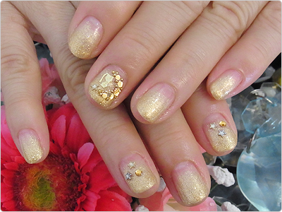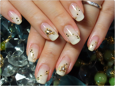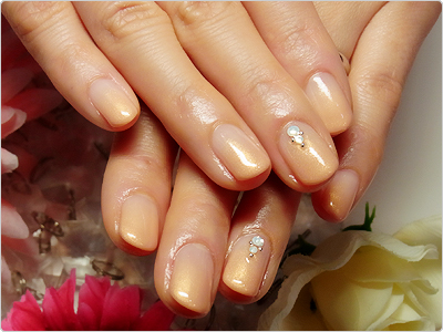 うっすらベージュの様なホワイトのグラデーションに秋らしくゴールドを組み合わせました。でも重くならないのがポイントですねっ。