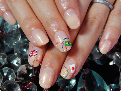 2012年はオリンピック!ヌーディーなモカベージュのグラデーションにラメラインで5輪を。もちろん日本国旗にはゴールド輪っか。