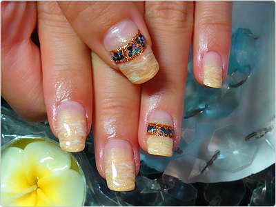7月のお得なジェルネイルデザインの茶系アレンジ。ゴールドのようで夏らしい色合いになりましたっ。
