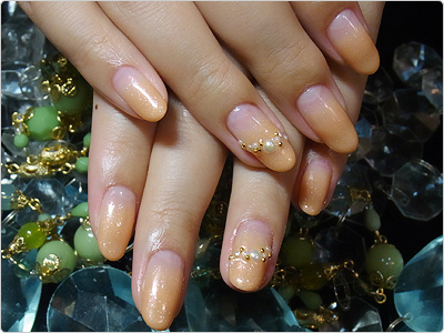 ヌーディーなベージュのグラデーションにキラリと上品に光るパールアートがさらに大人の女性っぽく見せてくれる大人ネイル。