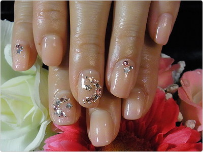 ヌーディーなベージュにピンクとクリスタルを組み合わせたお月様アートは、アクセサリー感覚でキュートっ。
