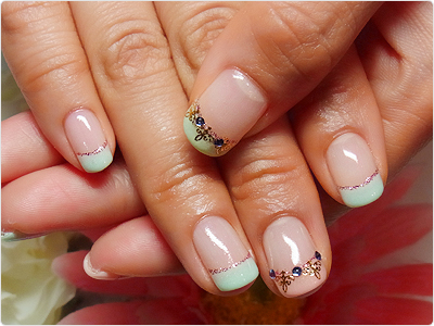 今月のGNフレンチタイプのアレンジver.沖縄の海の様な爽やかなブルーと優しいグリーンラメ。スターのパーツにアートを変更してオリジナルにカスタマイズ!