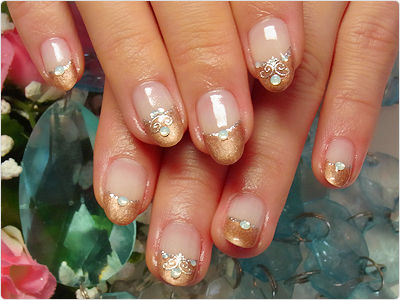 しっとりとしたモカベージュのグラデーションにフレンチ風にラメラインをプラス。ストーンアートにはブライダルにかかせない、サムシング・ブルーを入れて。