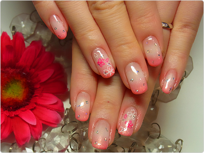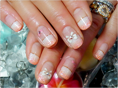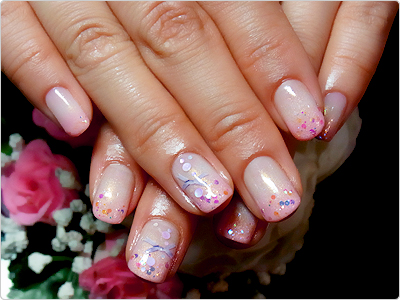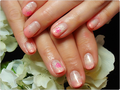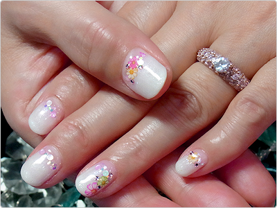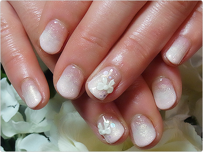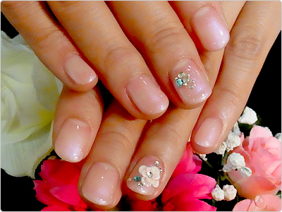上品な桜貝の様なカラーグラデーションにぷっくりお花とサムシング・ブルーを入れて
