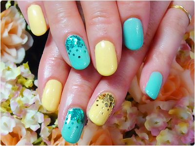 POPなブルーグリーンとイエローの一色塗。ポイントに同系色のホログラムでキラキラもプラスすればウキウキネイルの完成!