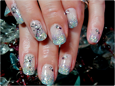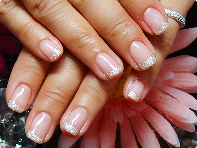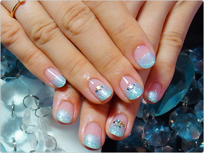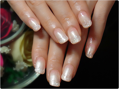 根本はクリア、先端シルバーのラメフレンチ。プラチナっぽいシルバーはとても品があってキラキラきれいですね。