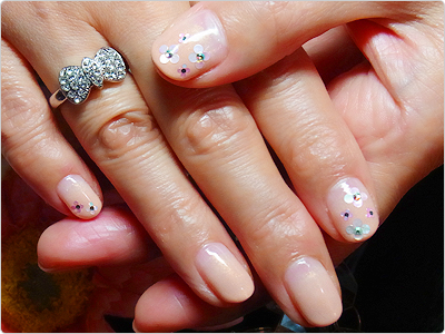 ヌーディーなカラーグラデーションにパステルのホログラムを散らしました。ポイントにダイヤの様なスワロフスキーがちょっぴりゴージャスに。