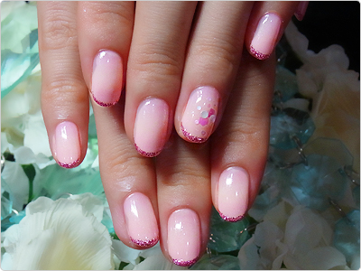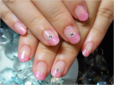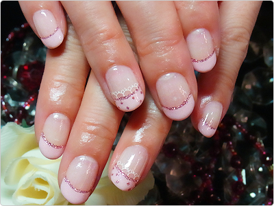 肌にとっても馴染むピンクにピンクのラメで細いフレンチのラインが上品にきらっと光りますねっ。