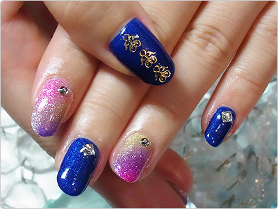濃紺と涼しげなラメに、エアーブラシのコンビネーション。クールだけどとってもさわやかな組み合わせですね!