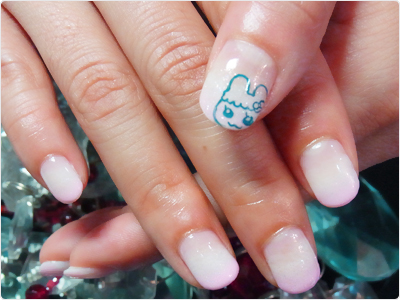 淡いホワイトからピンクへ変化していくグラデーションベースに親指にはたまごっちに出てくる『ちゃまめっち』をのぞかせました。