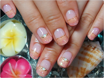 8月のお得なジェルネイルのフレンチアレンジ。ベージュとピンクラメの組み合わせがとっても落ち着いた雰囲気に。