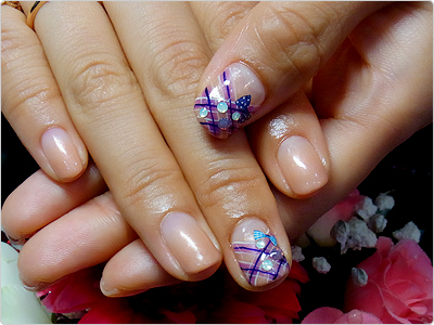 ヌーディーなベージュをベースにポイントでパープルのチェック柄アート。チェックの色を変えれば冬も楽しめます!