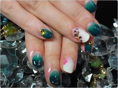 秋深まるイメージのモスグリーンのグラデーション。重たいイメージにならないのは、カラフルなストーンアートの彩り。大好きなAyuのマークもちらっと。