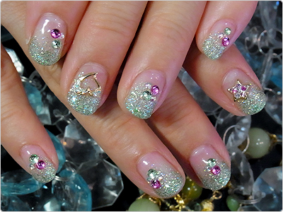 キラキラさわやかなグリーンのラメグラデにかわいいカラーのストーンアート。特別なネイルの時にはこのアクセサリーの様なパーツがおすすめですよっ!