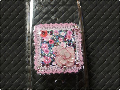スマートフォンのハードケースにデコレーション。 とってもかわいいレースのフレームの中には、色とりどりの バラとキラキラが。これぞ、女の子のスマホ道!