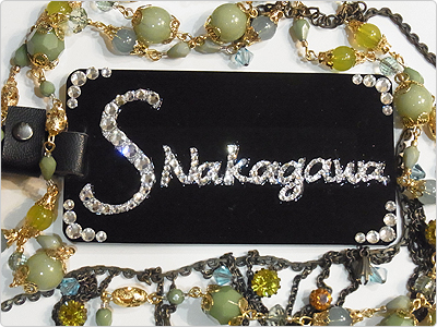 プレートは持ち込み。お名前部分をスワロフスキーでお作りしました。これなら荷物が離れていても一発で見つけられますね。