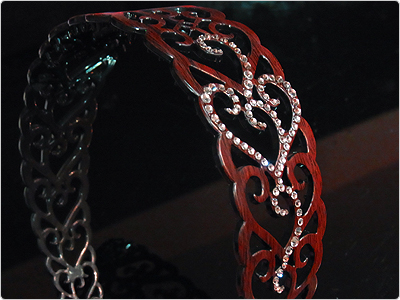 落ち着いた木目調のカチューシャに、キラキラスワロフスキーでポイントデコ。アクセントになってオシャレ度UP!