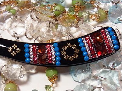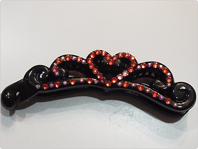 オリエンタルな色合いのスワロフスキーを組み合わせたオリジナル・バナナクリップ。大きめなのでロングヘアーでもバッチリまとまります。