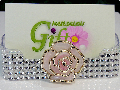キラキラしたボディに華やかなお花が咲いたカードスタンド。名刺や、ショップカードスタンドとして・自宅のメモ帳スタンドとしてご利用できます。